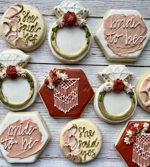 Detailed decorated cookies usually take more than 3 colors of icing, includes additional techniques such as airbrushing, layering, basic floral accents, gold details, etc. Detailed cookies start at $65.00 per dozen.